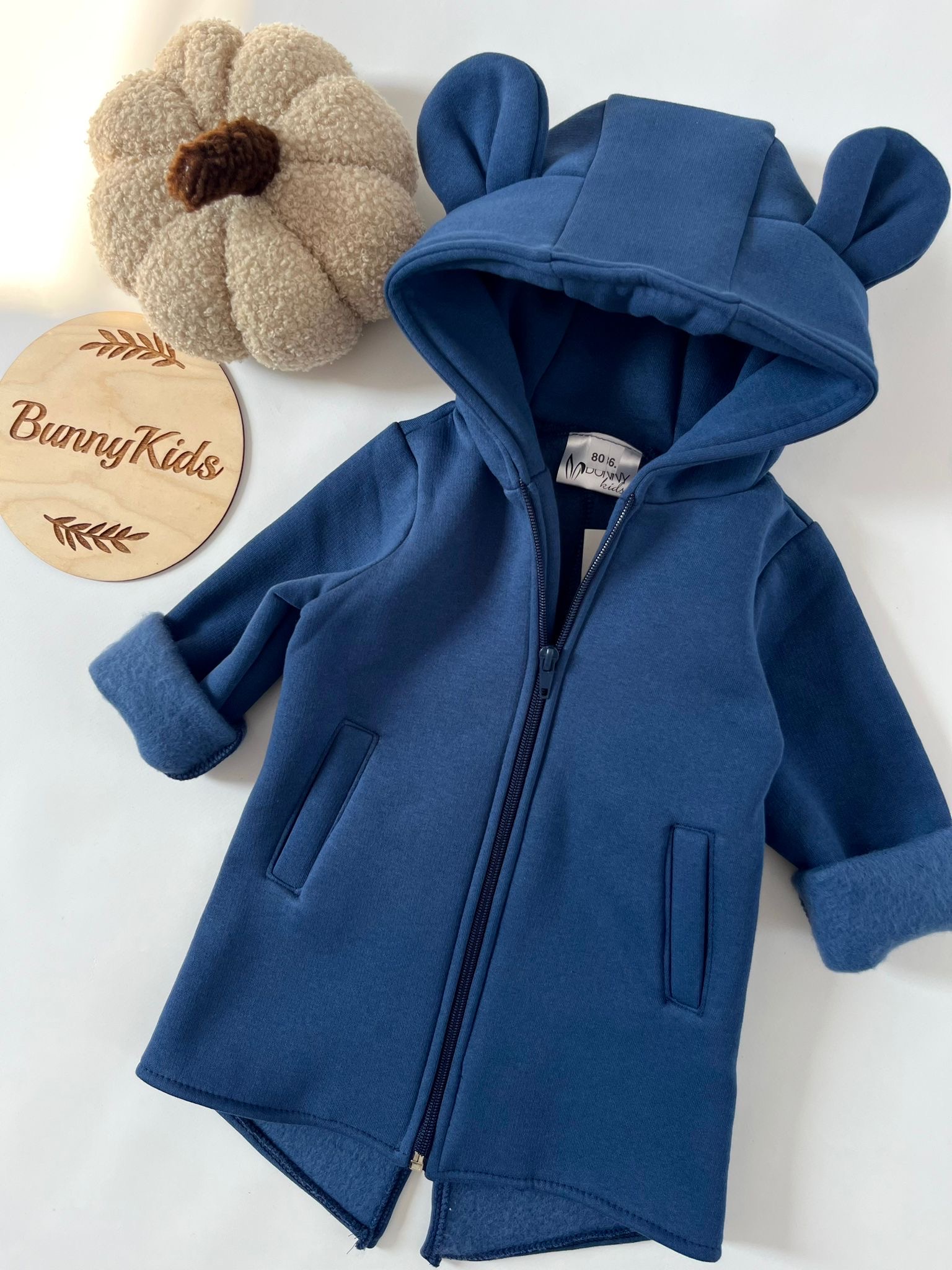Štýlový hrejivý mikino-kabátik s uškami Medvedík od Bunnykids – farba JEANS:
