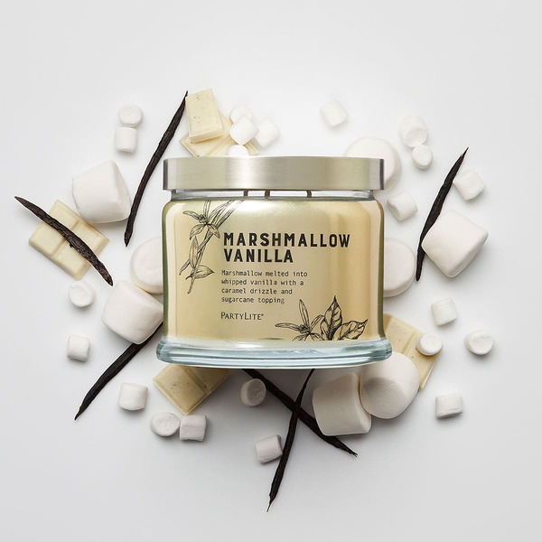 - Marshmallow Vanilla je zmes marshmallow a šľahanej vanilky rozpustenej s karamelovou kvapkou a polevou z cukrovej trstiny. Užite si ju v našej prémiovej forme vône, Sviečke s 3 knôtmi. Naše sklo je vyrábané dvoma rôznymi dodávateľmi a môže sa mierne líšiť vo vzhľade. Stále majú čistý vosk a dlhú dobu horenia, ktorú všetci milujete!